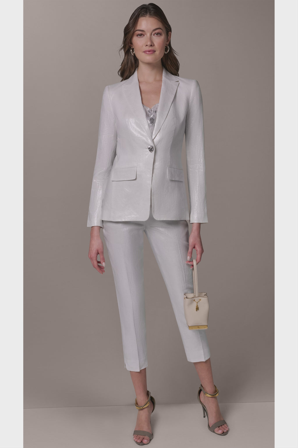 Rendered in breathable linen and finished with a subtle, light-catching sheen, this blazer redefines warm-weather tailoring with quiet impact. A fluid shawl lapel and softly structured waist create shape without rigidity, while the single-button closure refines the silhouette with streamlined intention. An elevated way to wear linen, it pairs seamlessly with the matching cropped trousers for a modern suiting moment. Add strappy heels and a sculpted wristlet to carry the look from daytime engagements into evening with effortless polish.