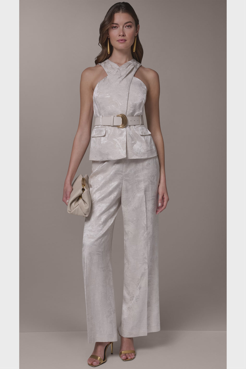 Rendered in a softly lustrous jacquard, this belted vest catches the light with subtle dimension and refined movement. The wrap-effect halter silhouette frames the shoulders and collarbone with sculptural ease, while the cinched waist sharpens the line against fluid tailoring below. Style it with the coordinating trouser and a metallic pump for a polished statement.