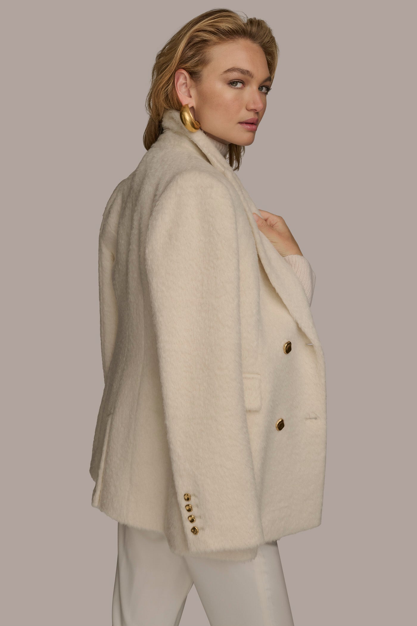 Your favorite wool coat in blazer form. Crafted in soft, textured fabric, this style comes in a double breasted silhouette, with a peak lapel and brushed hardware buttons at the front.