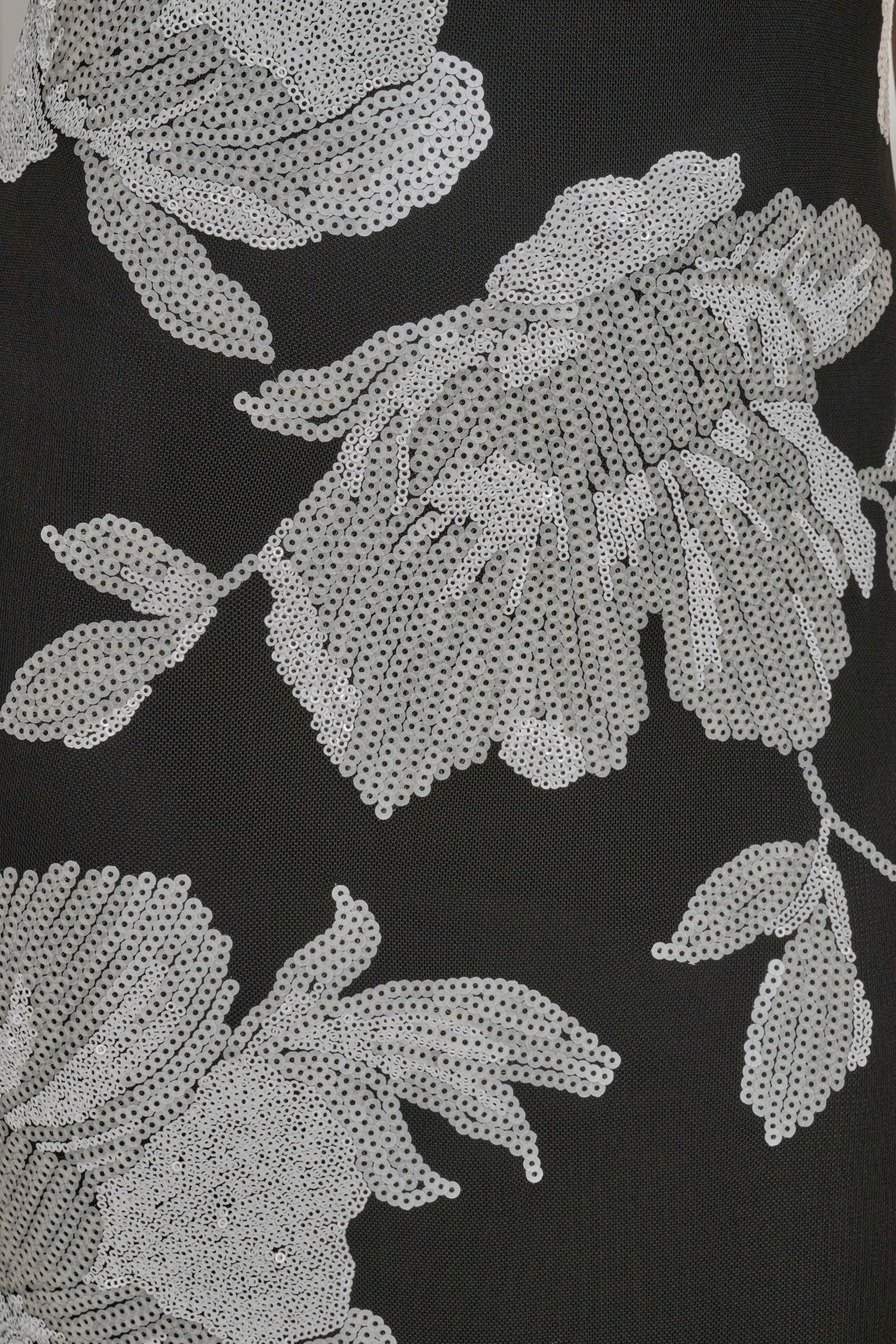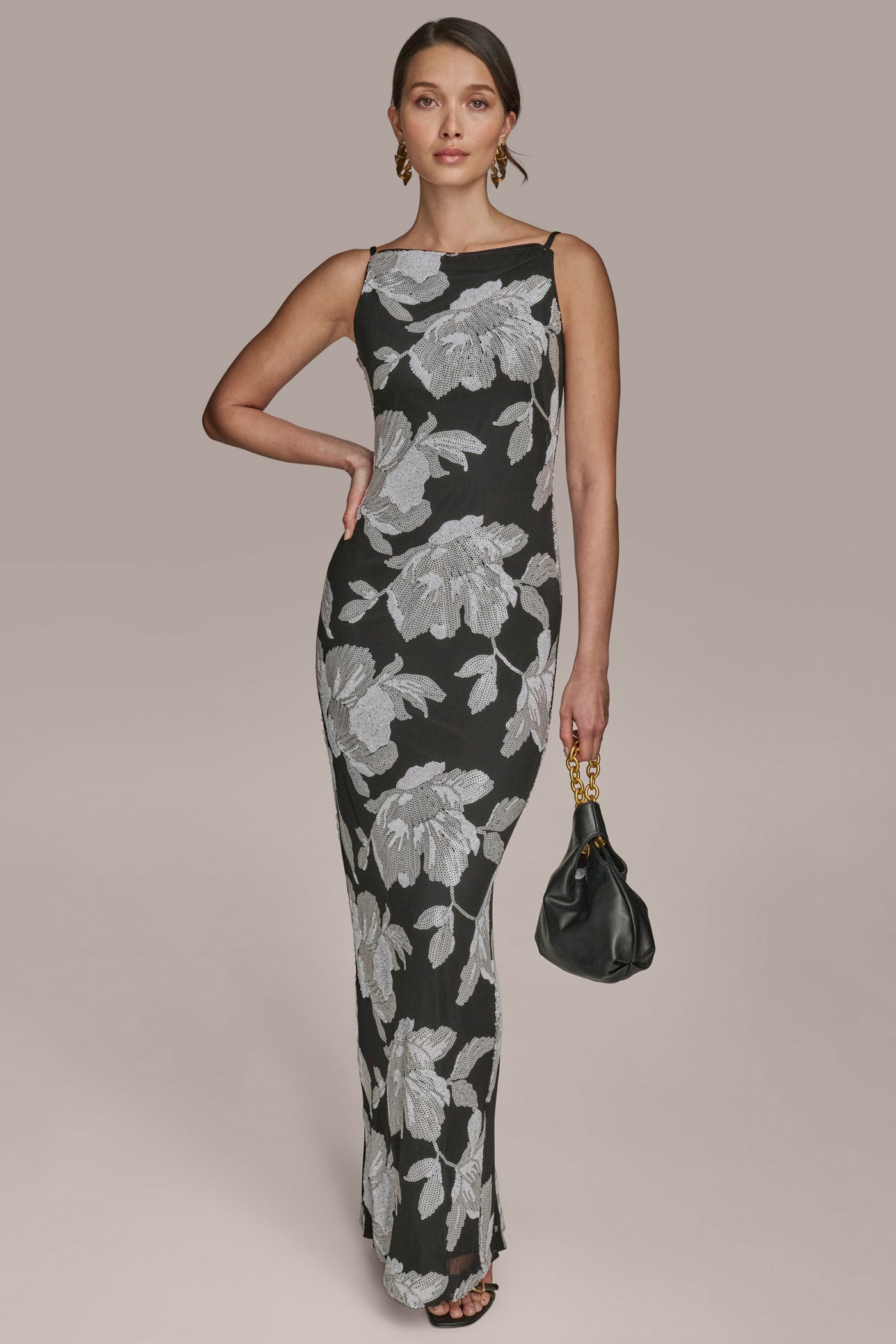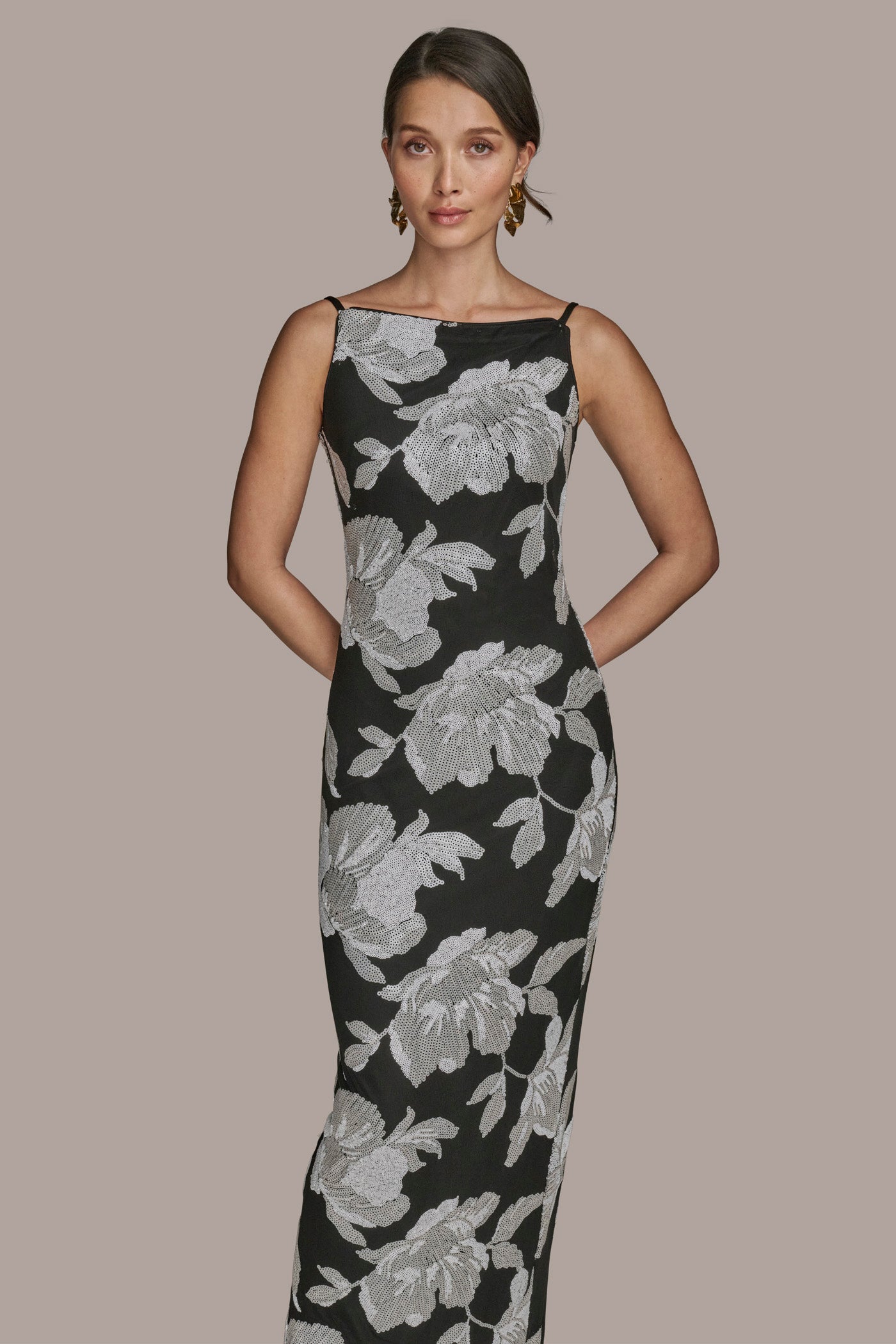 Intricate floral sequins elevate this Donna Karan gown, offering elegance in motion.
