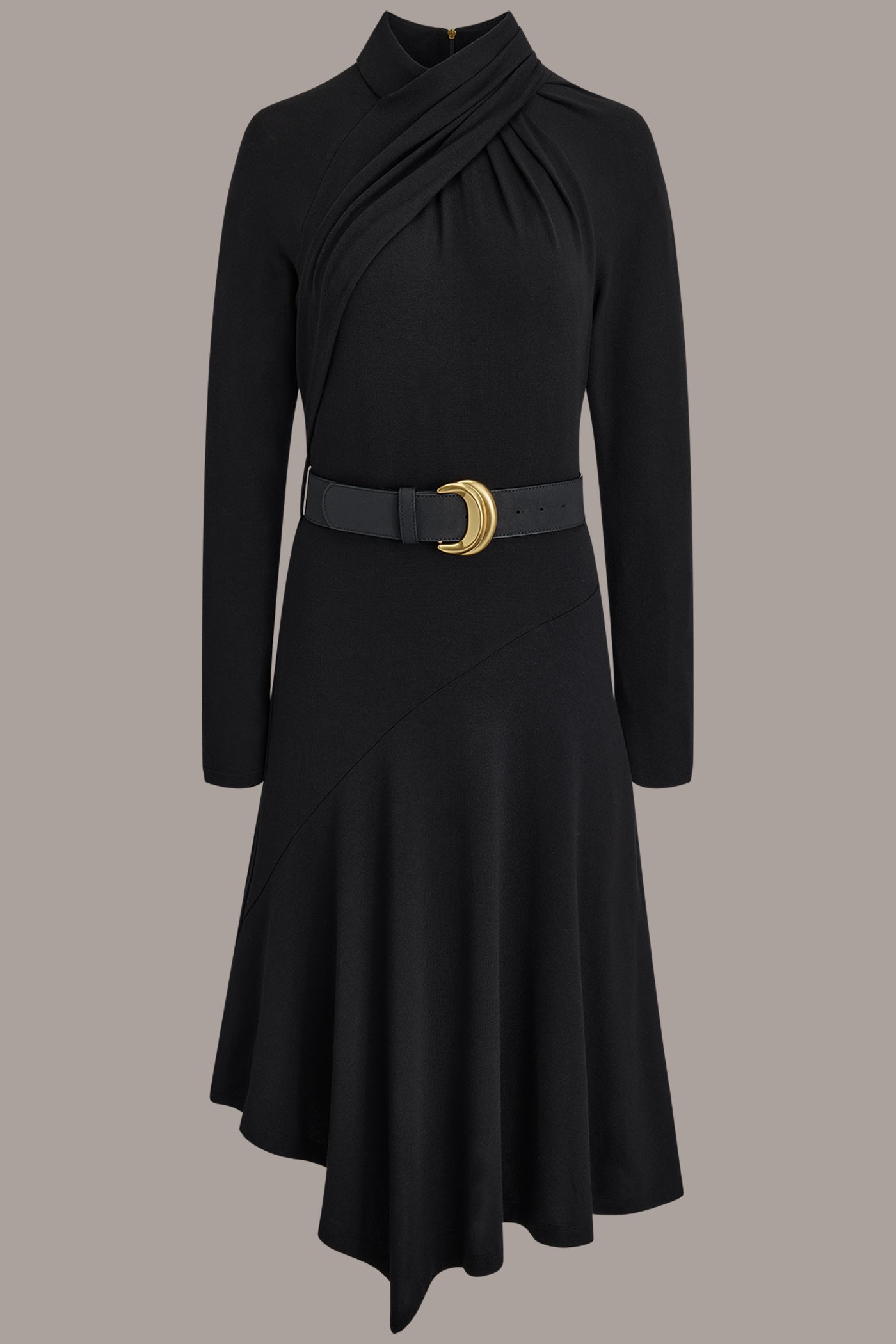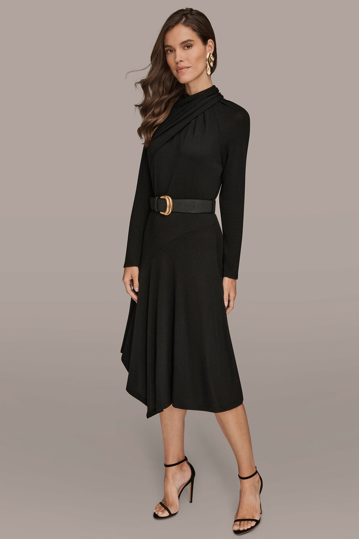 - Long-Sleeve Mock-Neck Twist-Front Midi Dress with Hi-Low Hem