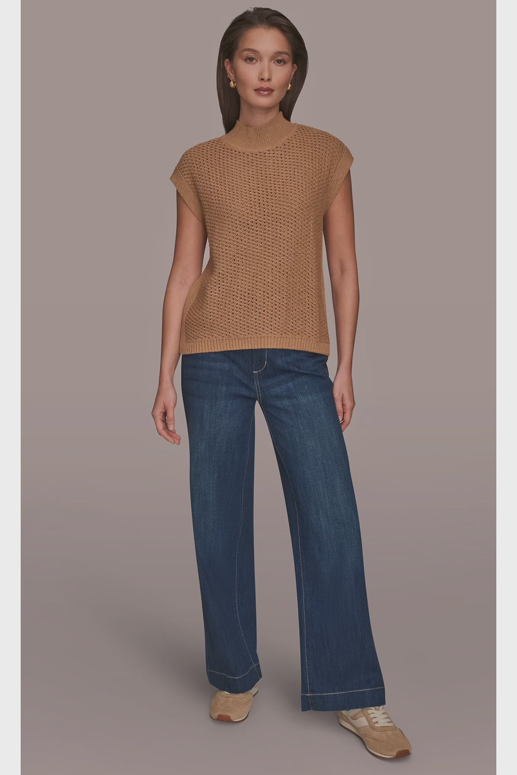 SLEEVELESS MOCK-NECK OPEN STITCH SWEATER