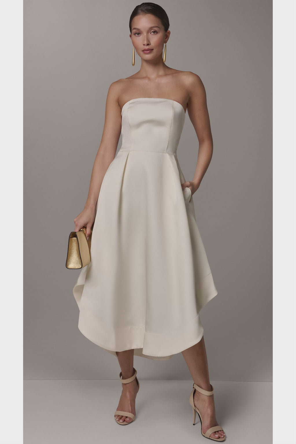 Elevated minimalism takes center stage in this strapless midi gown. Its sculpted bodice and expertly placed pleats open into a voluminous skirt defined by a handkerchief hemline. Crafted in structured Mikado that maintains its shape beautifully, it feels both modern and momentous. Gleaming gold jewelry and razor-sharp heels complete an impeccable look for a cocktail gala that calls for polished impact.