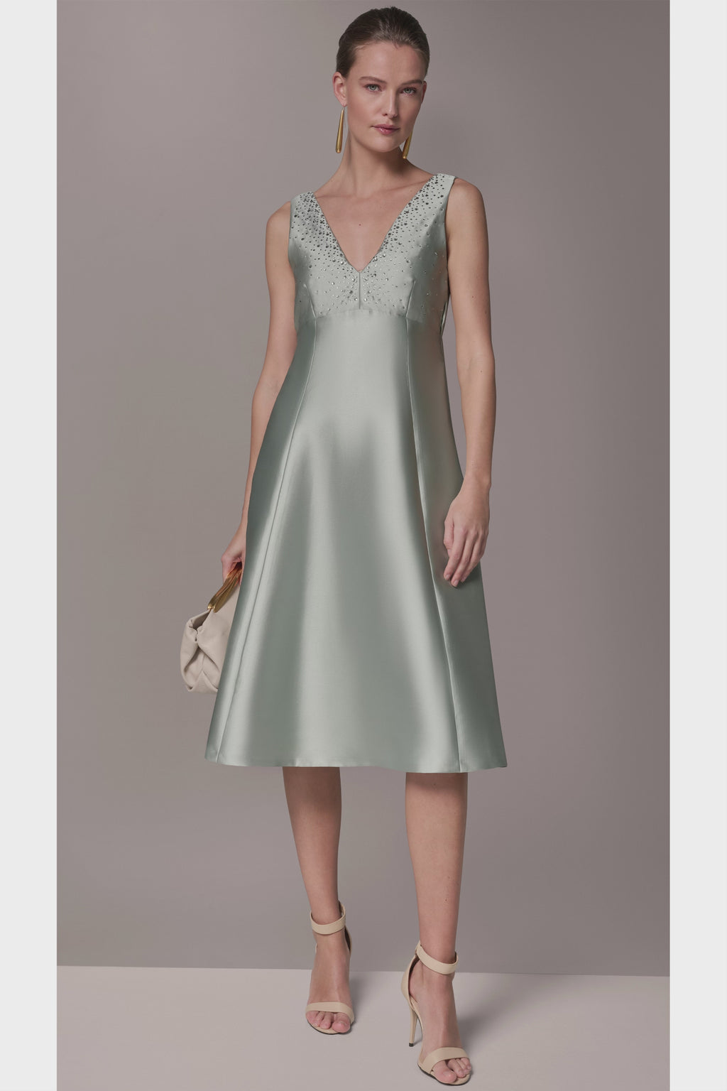 Radiant in its restraint, this Mikado midi gown pairs architectural structure with delicate sparkle. Crystals illuminate the V neckline, glinting subtly against the satin-smooth surface and drawing the eye upward. Expertly contoured seams refine the bodice before unfolding into a poised fit-and-flare skirt that maintains its shape with crisp authority. Ideal for cocktail receptions and formal evenings; it comes alive with minimalist heels and a sculptural clutch that underscores its refined glamour.