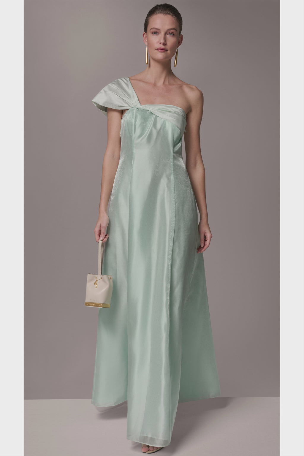 The sculpted twist at the shoulder of this one-shoulder ball gown creates a striking focal point, while the fitted bodice gives way to a sweeping, floor-length skirt with ethereal volume. Sheer organza overlays lend depth and dimension, lending a subtle, cinematic sheen that makes it a definitive choice for a black-tie gala. Nod to its dramatic flourishes with a sculpted wristlet and gleaming heels for maximum impact.