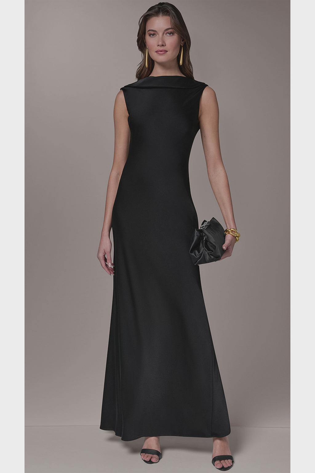 Designed for evenings that call for presence without excess, this draped slip gown exudes fluid confidence. Cut from lustrous satin that skims the body; it features a soft cowl neckline that leads to cascading ruffles at the back. Thin, strappy heels are all that are required to let it shine.