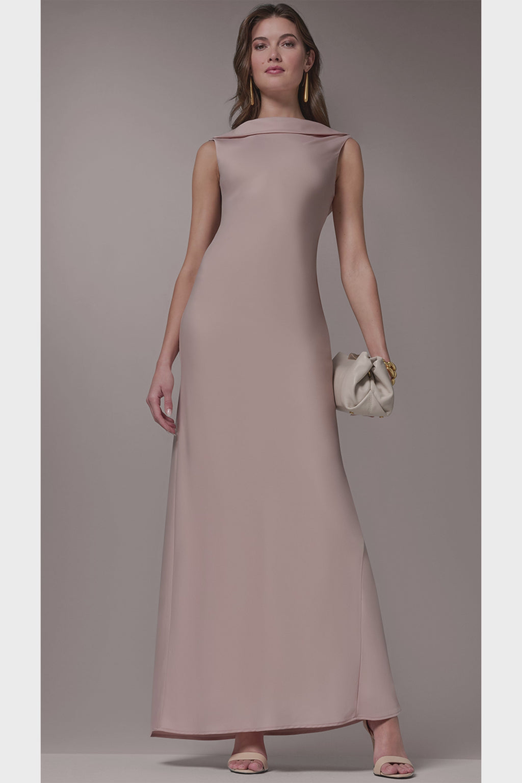 Designed for evenings that call for presence without excess, this draped slip gown exudes fluid confidence. Cut from lustrous satin that skims the body; it features a soft cowl neckline that leads to cascading ruffles at the back. Thin, strappy heels are all that are required to let it shine.