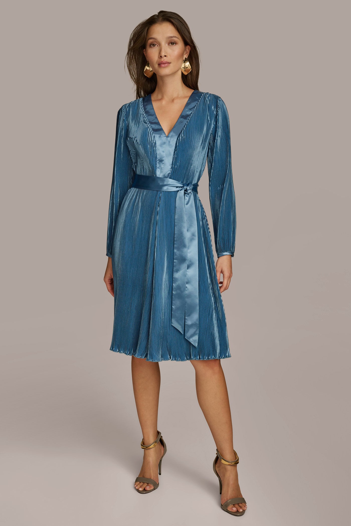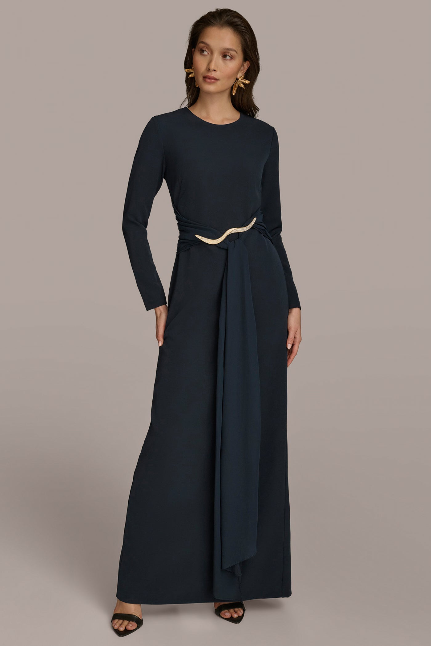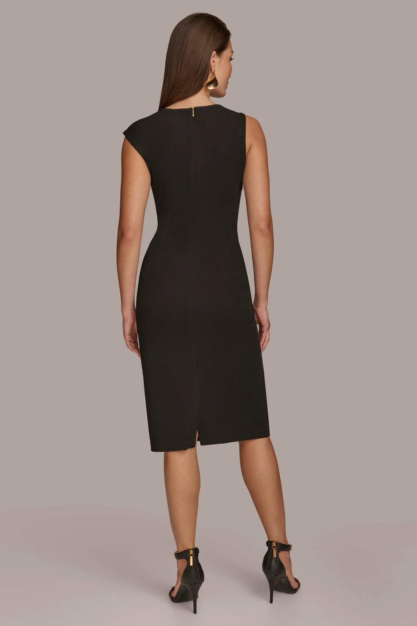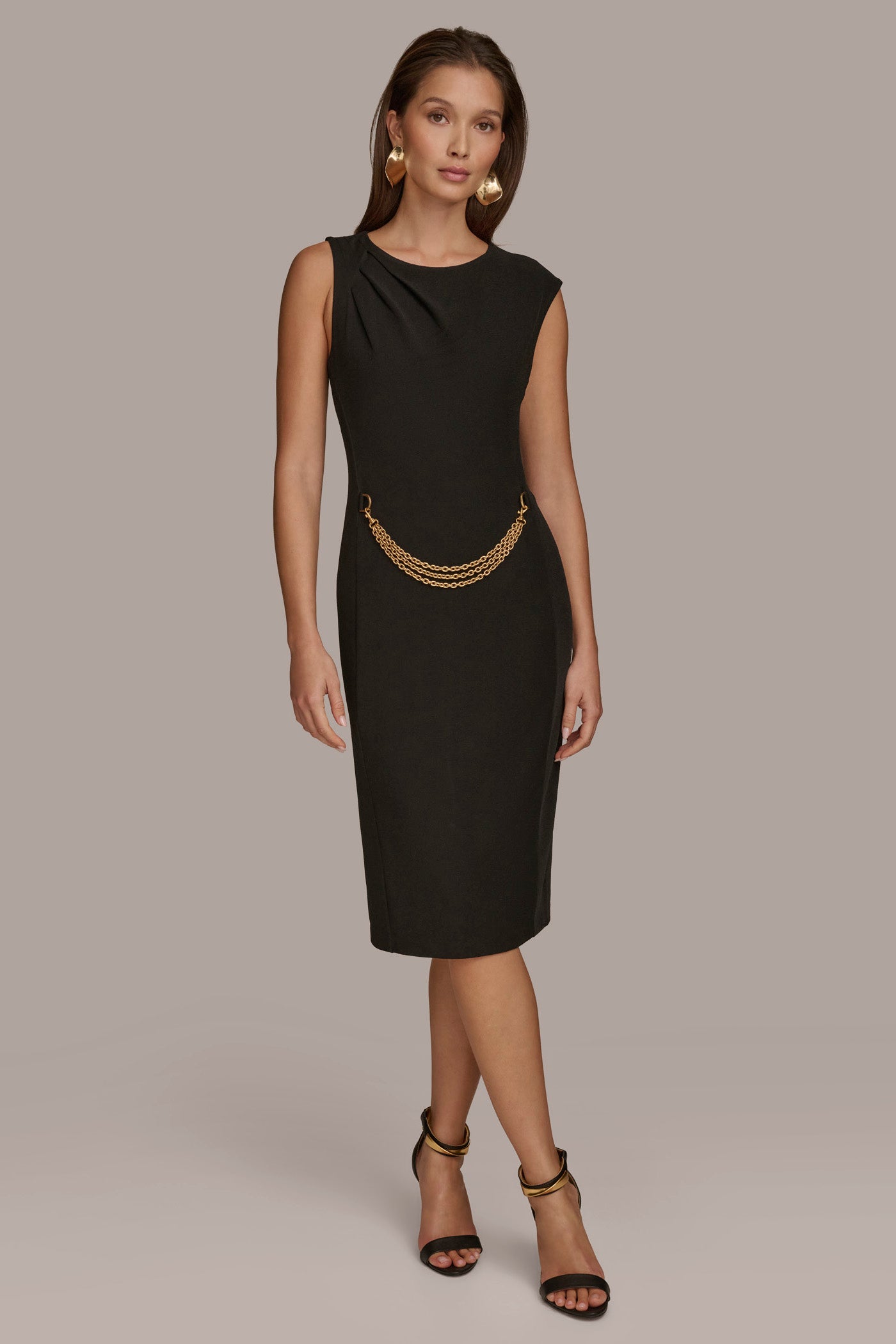 PLEATED SHOULDER DRESS WITH CHAIN BELT