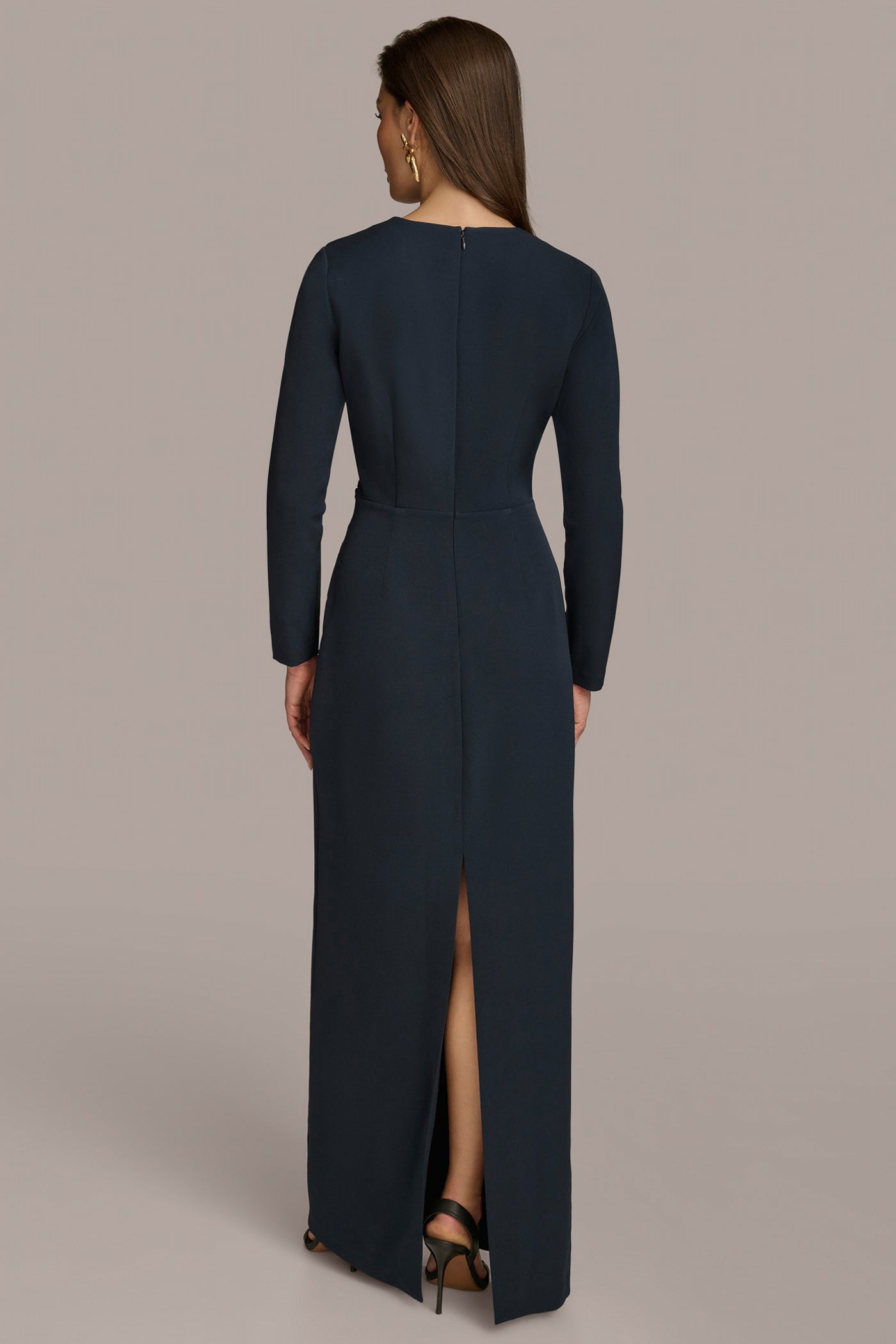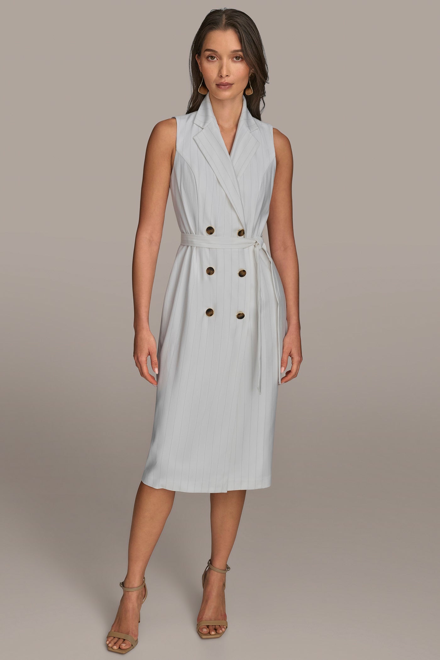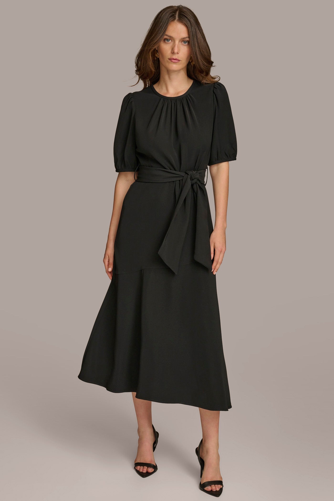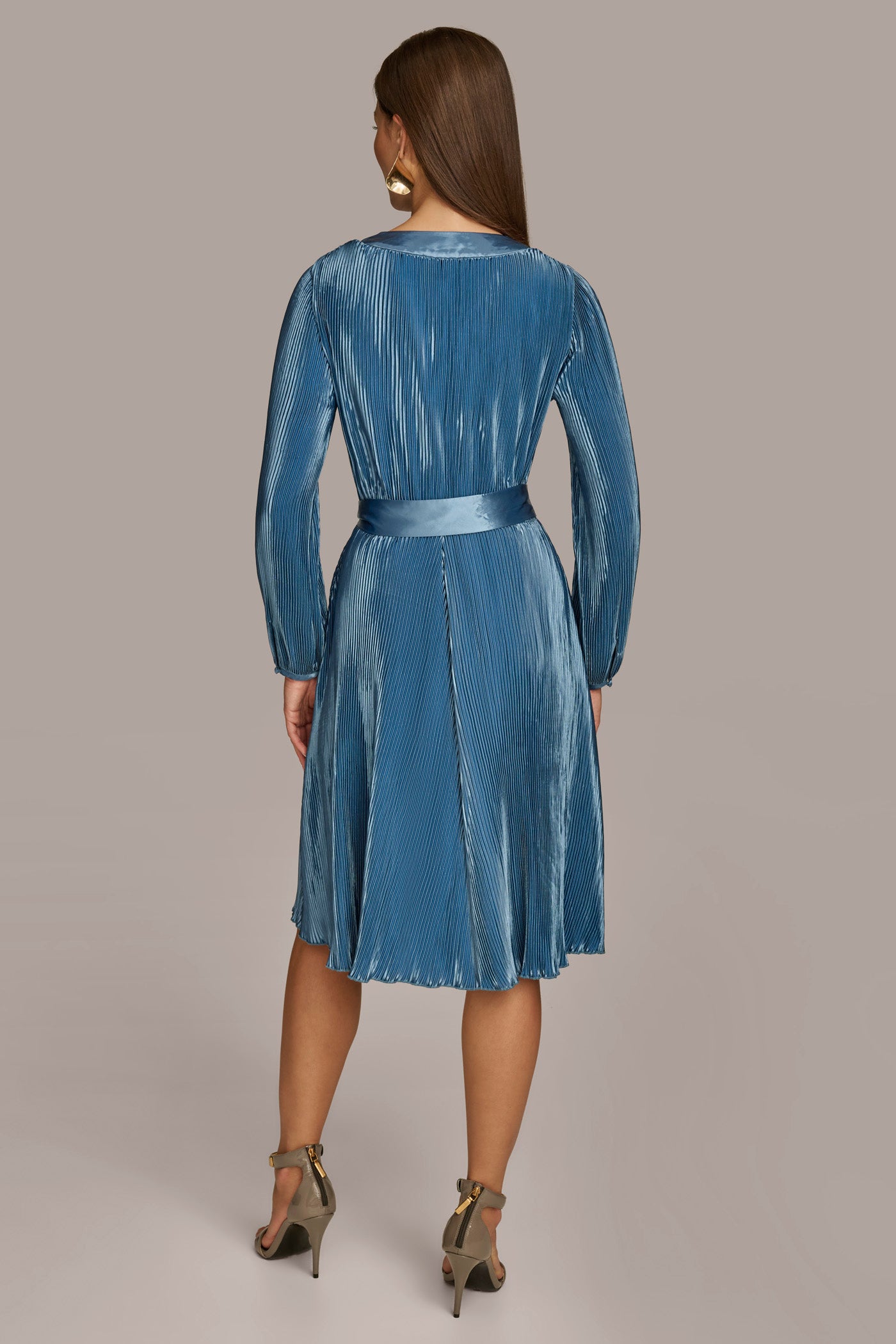PLEATED SHOULDER DRESS WITH CHAIN BELT