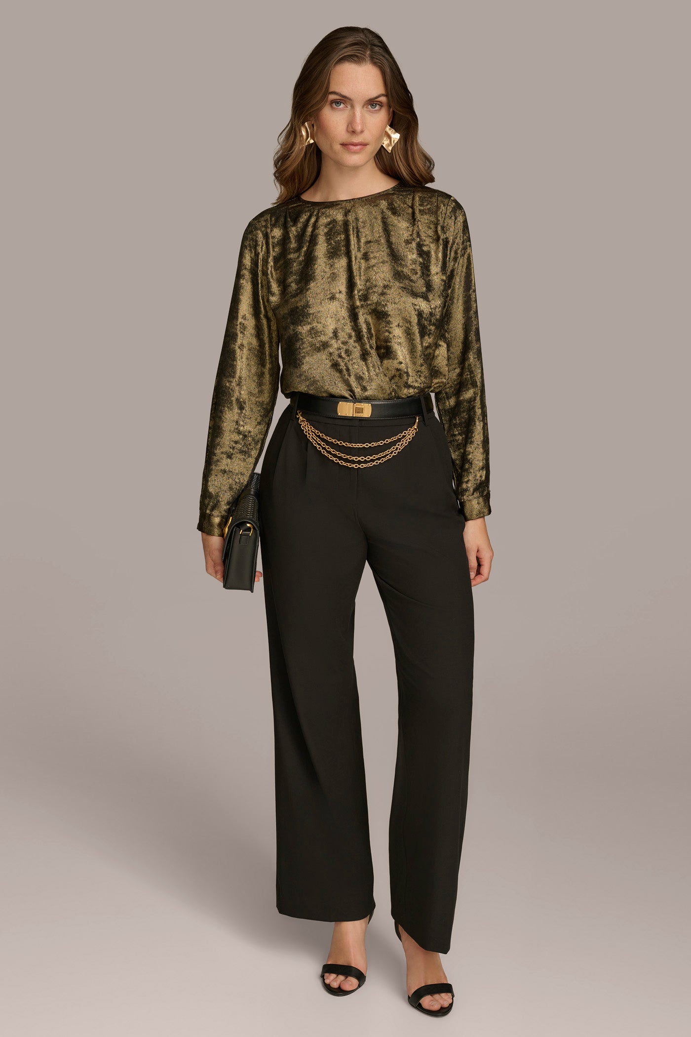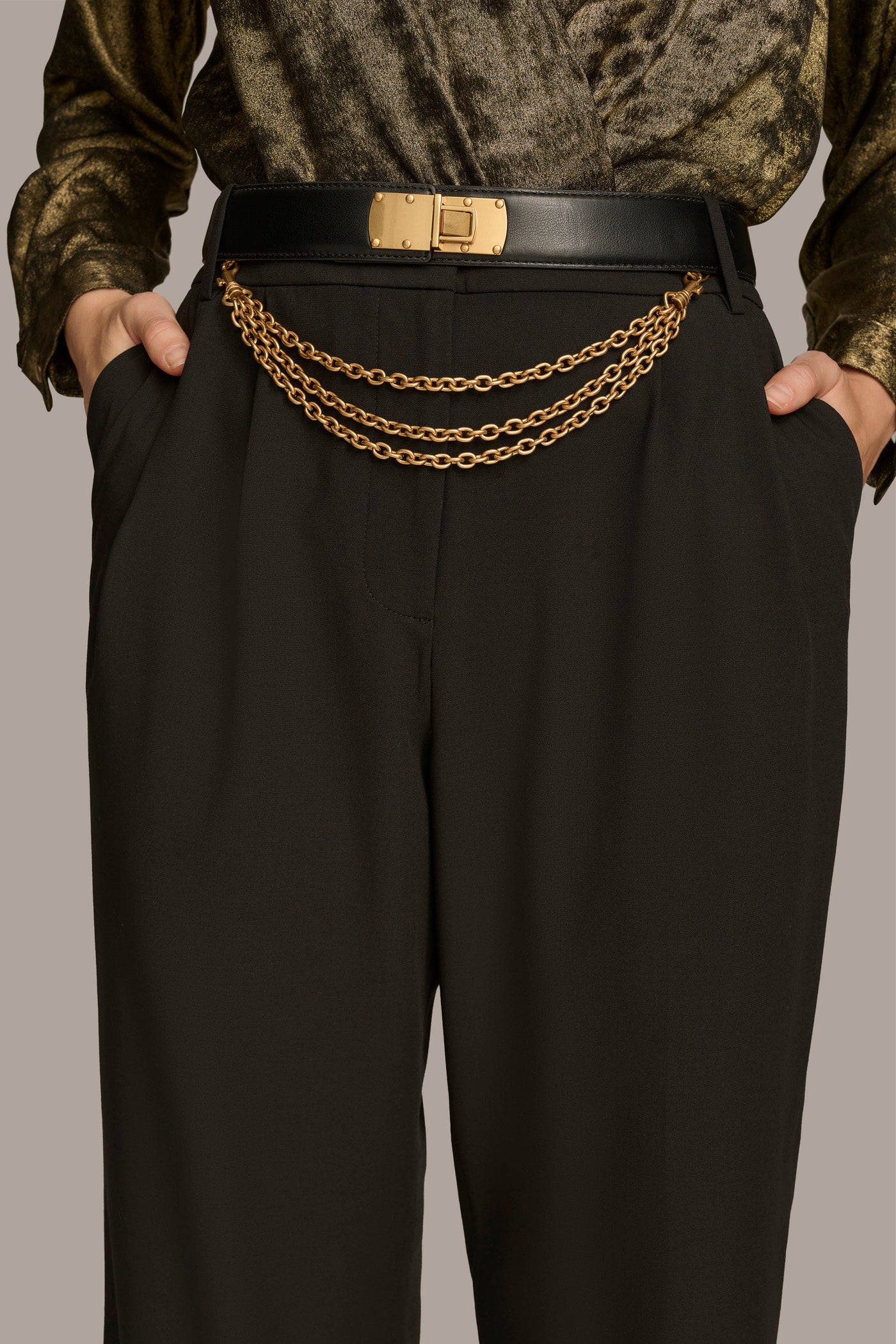 A sleek wear-to-work staple. These classic high-waisted suit trousers feature an easy wide leg, a chain belt at the waist, and pleating down the front.