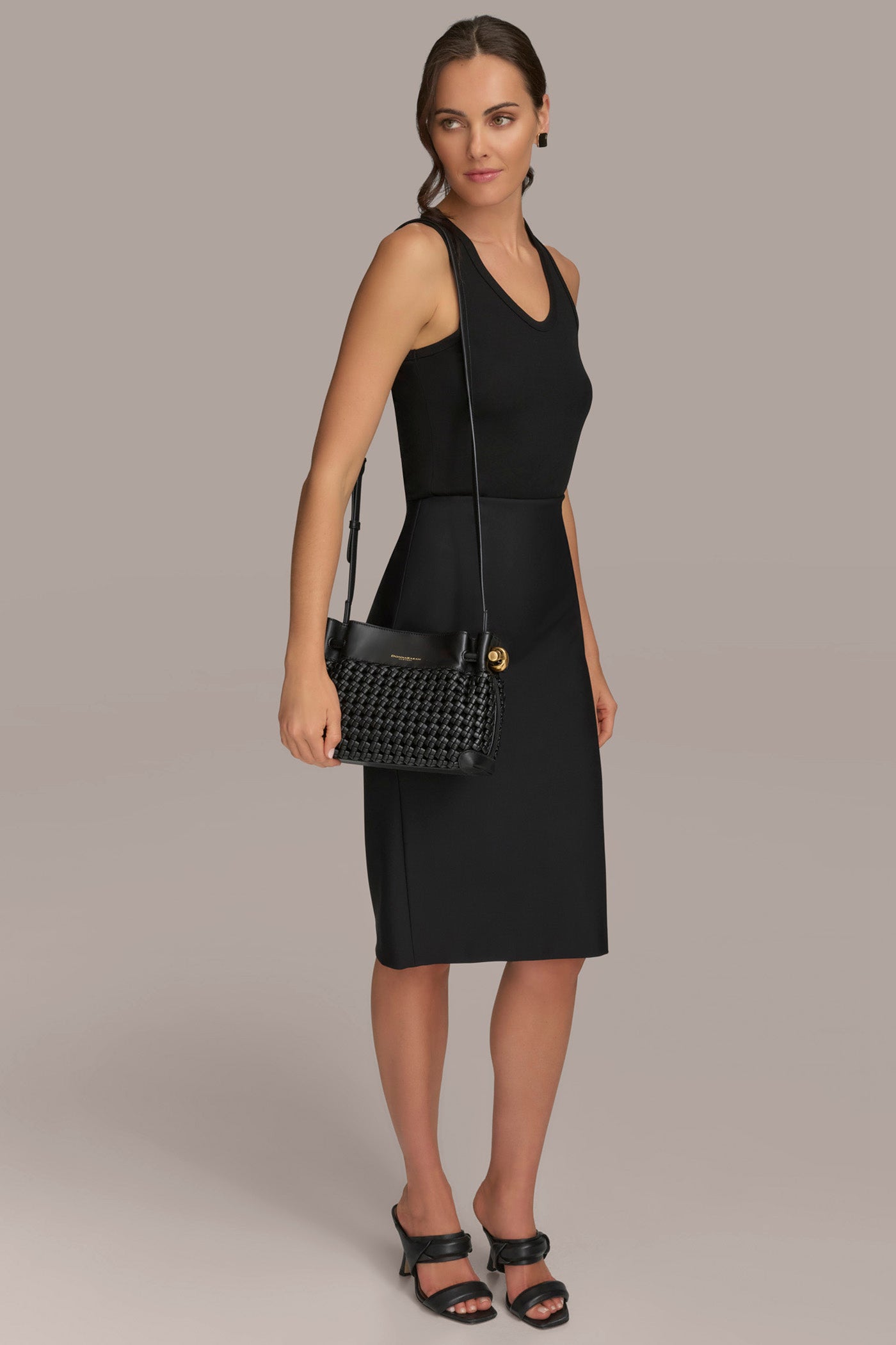 Crafted in intricately woven leather, this elegant crossbody completes any ensemble with luxurious texture and striking style. Perfectly sized for everyday, hands-free carry, it’s finished with knotted hardware and a slim, adjustable shoulder strap.