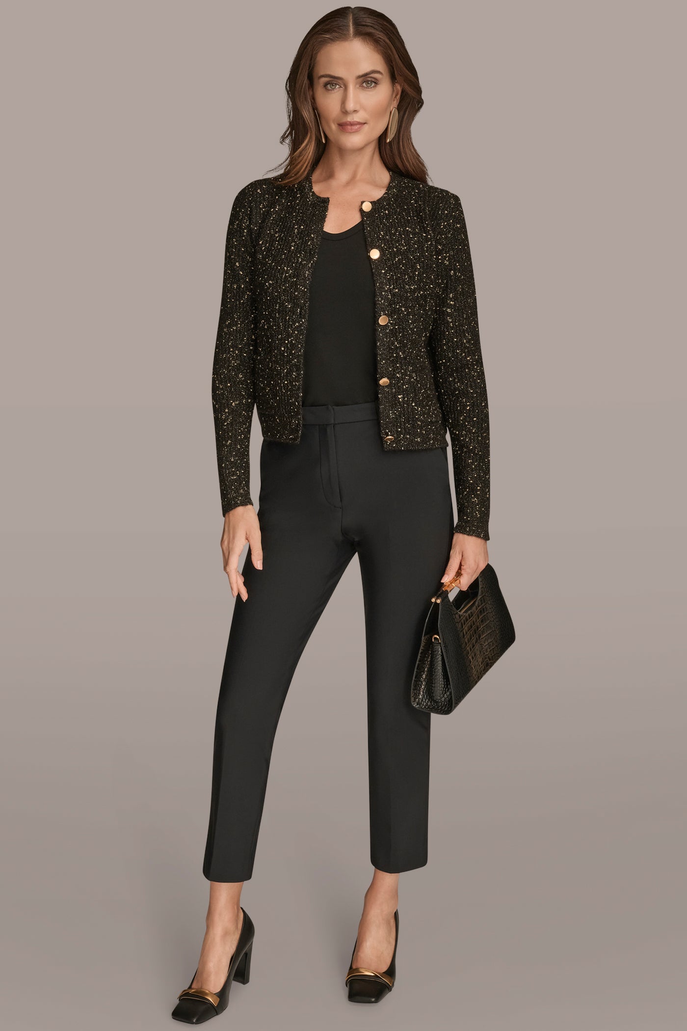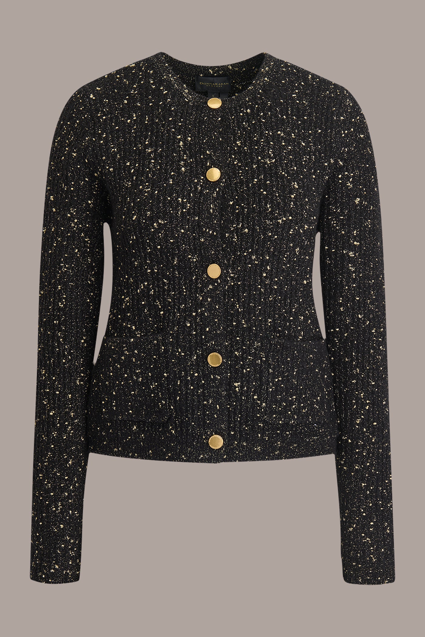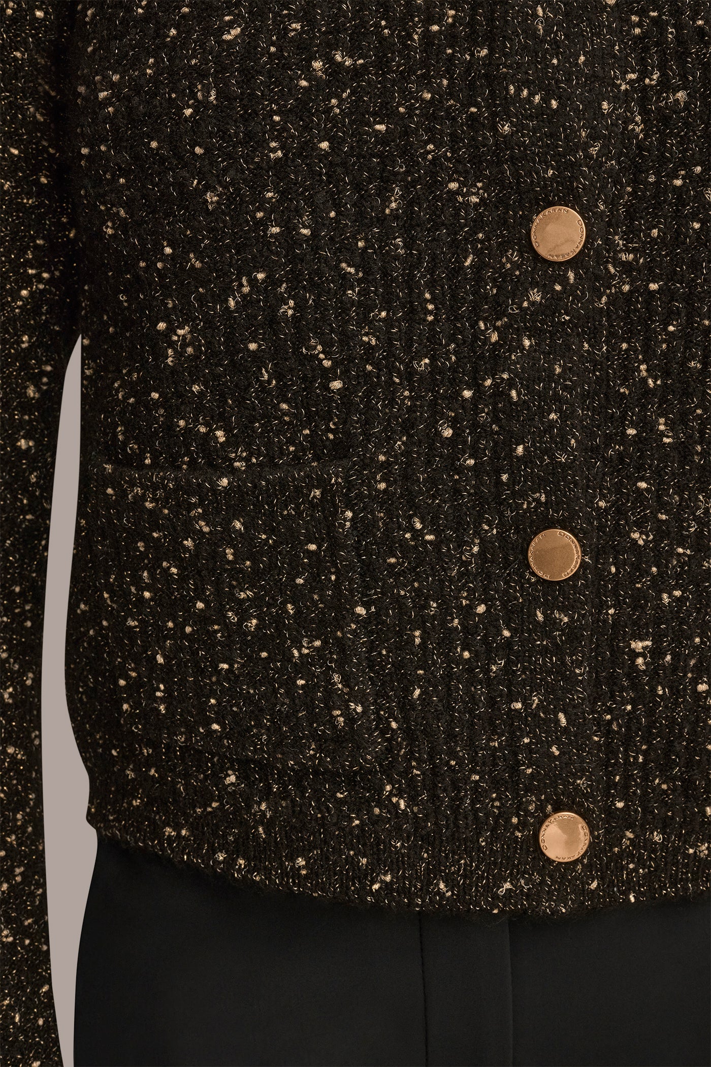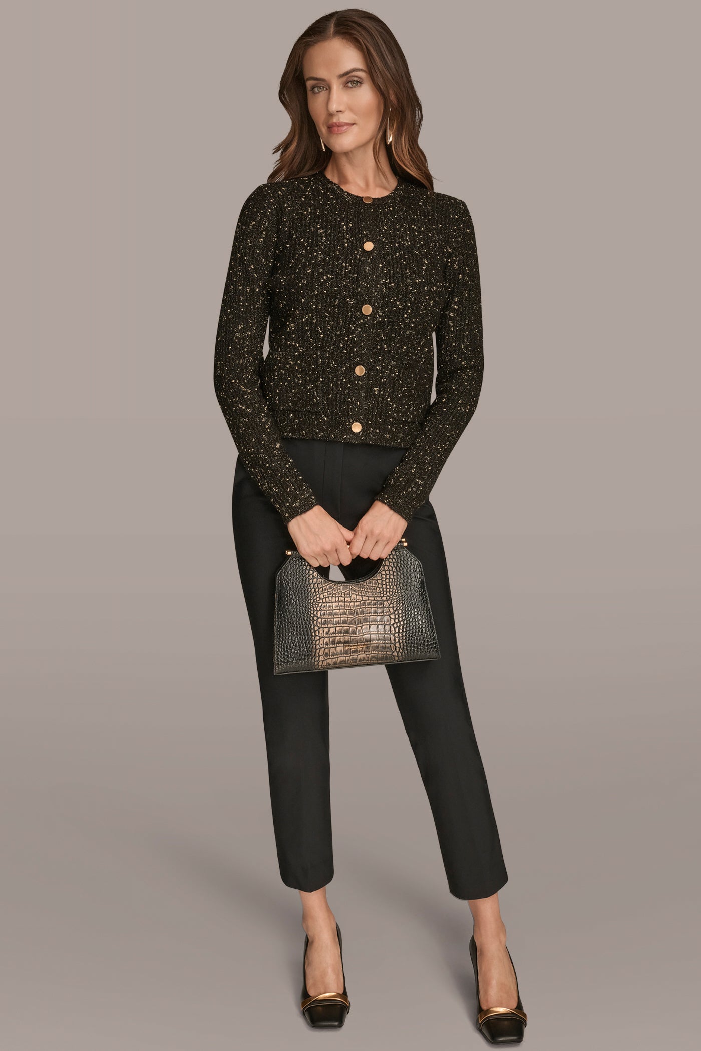 The statement is in this cardigan--classic in silhouette with just enough sheen to elevate a midi and boot ensemble.