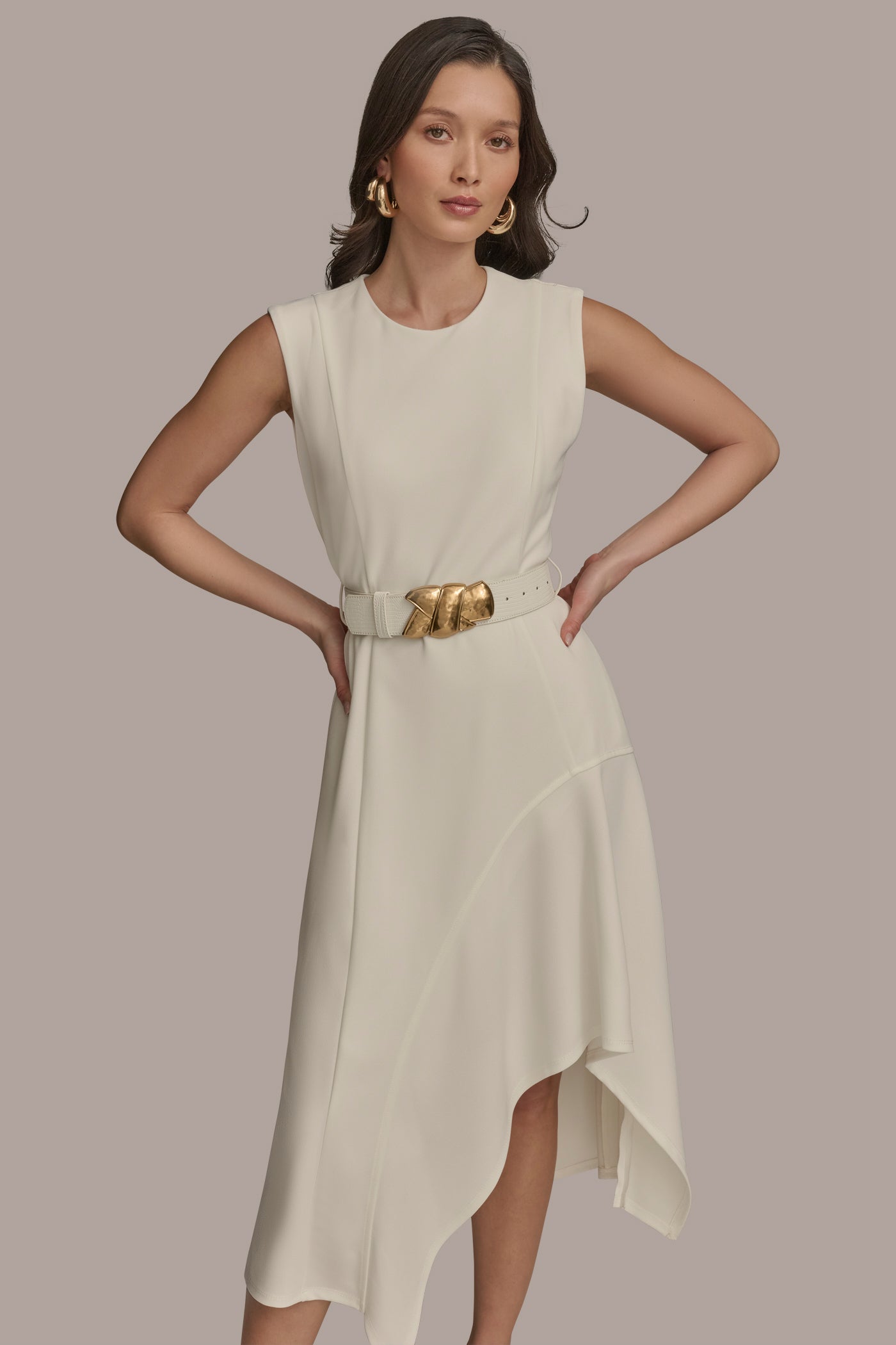 This dress is a modern classic with sleek versatility. An asymmetrical hem adds allure and movement, while a belt embellished with custom